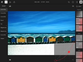 -Exposure, Contrast, Highlights and Shadows, Temperature, Distortions, Vignette, etc. All the basic editing features are available, as well as new tools such as chromatic shift.